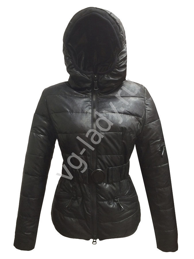 Куртка кожзам с капюшоном, наполнитель пух, немного приталена,ремень