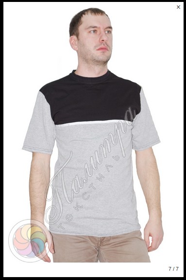 Футболка мужская комбинированная с настроченным лампасом по центру, являющийся особенностью для этой модели, горловина изделия обработана рибаной. Модель имеет разные расцветки. Для пошива футболок используется трикотаж, кулирное полотно, состоящее из 100% хлопка, плотностью 150 г/м2.