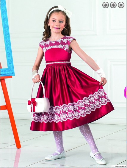 Изумительное платье из плотного атласа для праздничных мероприятий. Классический лиф без рукавов с круглым вырезом по горловине. Многослойная юбка длиной 7/8 дополнена подъюбником из хлопка. Платье фиксируется при помощи застежки-молнии, а удобный пояс позволяет регулировать посадку. Модель декорирована ажурным кружевом и искусственным жемчугом.