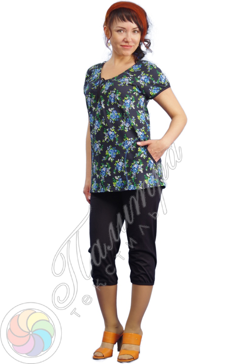 Прекрасный женственный костюм из лёгкого трикотажного полотна, состоит из короткой туники цветочной расцветки и облегающих бридж на широкой эластичной резинке.