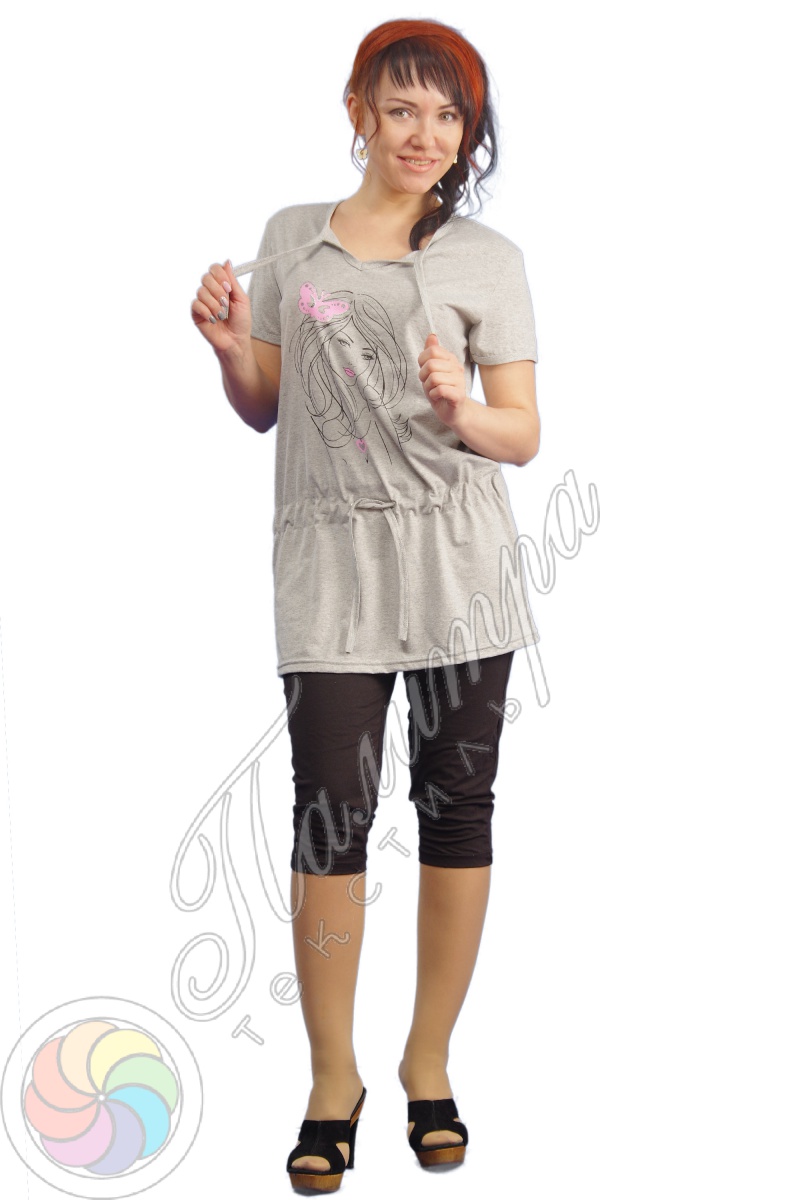 Туника с поясом выполнена из хлопковой трикотажной ткани. Изделие дополнено оригинальным принтом.
