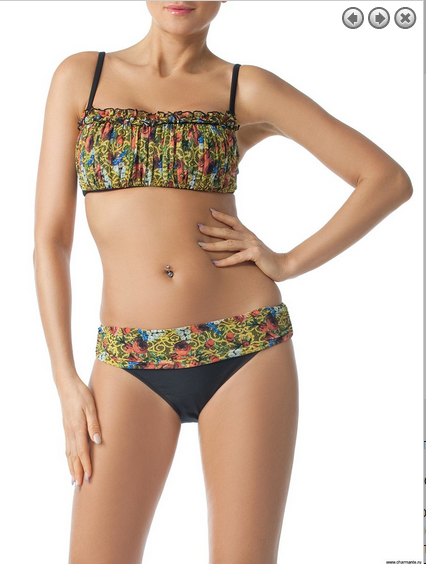 Популярный раздельный купальник. Изысканная модель-бандо оригинальной формы с густой драпировкой из мягкой эластичной сетки, регулируемыми узкими бретелями и широкими завязками на спине. Плавки комфортной посадки с широким драпированным поясом. Купальник выполнен в комбинированной манере из блестящей лайкры и эластичной сетки в стильном сочетании принта и однотонной ткани. Оригинальный рисунок венецианского кружева с букетонами из роз и незабудок в деликатном цветовом решении является ведущим лейтмотивом всей коллекции купальников.