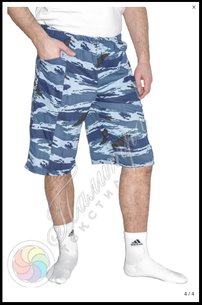 Отличные шорты из камуфлированного трикотажа с накладными карманами. Для производства изделия используется кулирное трикотажное полотно плотностью 150 г/м2, составом 100% хлопок.