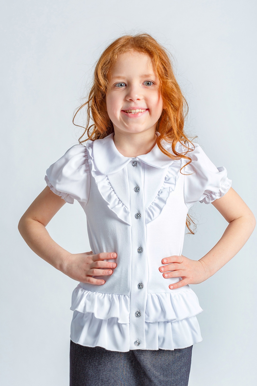 Описание: Блузка для школы и торжеств,изготовлена из интерлока,праздничный вид придают рюши и воланы из "Ниогары",рукав "фонарик " , застежка пуговицы .