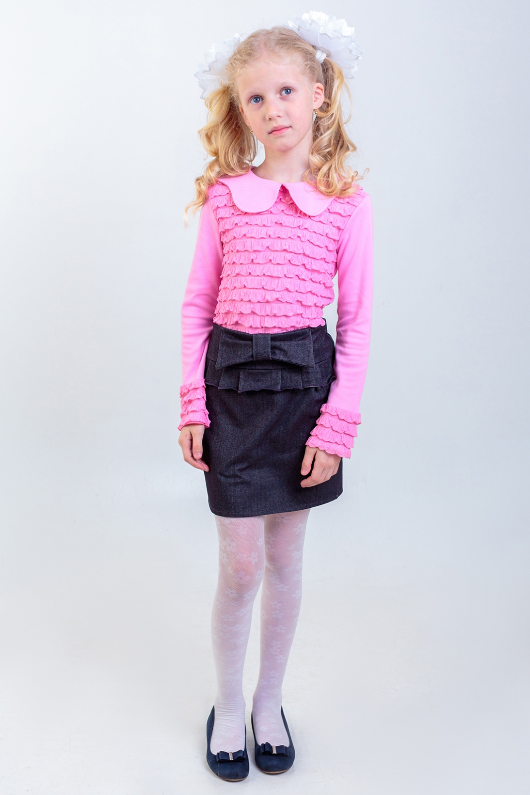 Описание: Нарядная блузка .подойдет как на праздник ,так и для школы.Выполнена из трикотажных полотен , полочка и манжеты состоят из мелких очаровательных рюшечек.