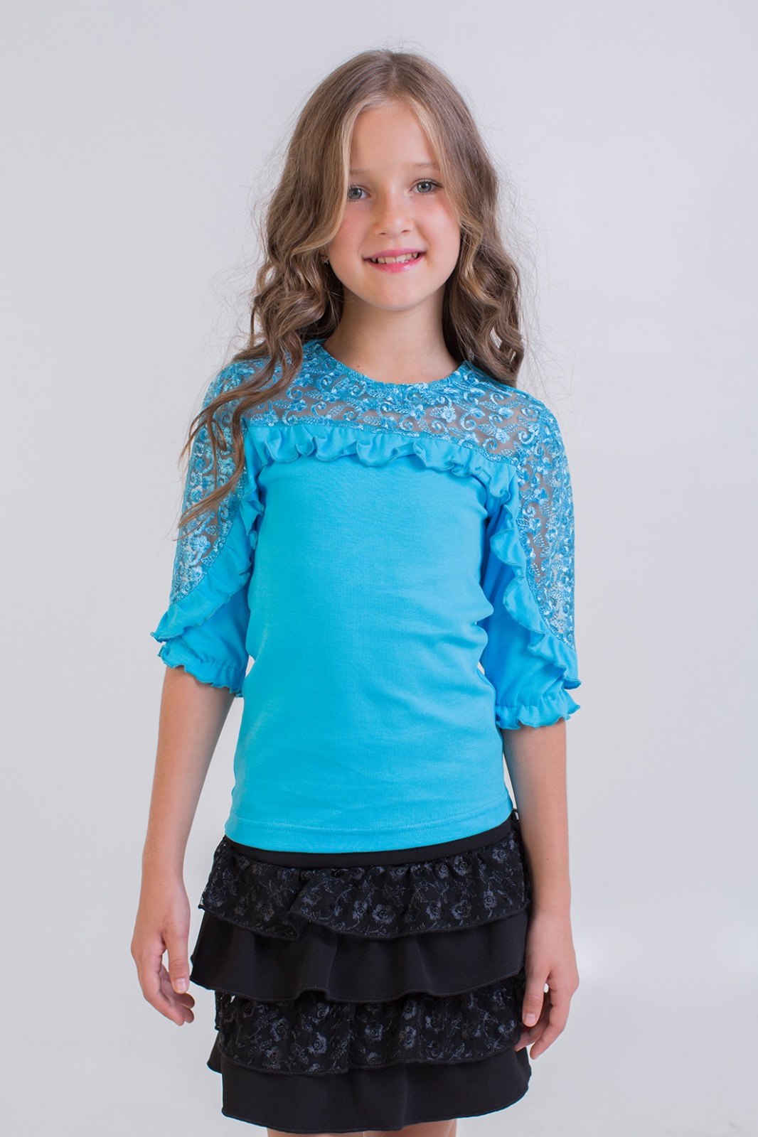 Описание: Блузка белого цвета выполнена из интерлока и оринтала. Очаровательные рюши на полочке и по рукавам придают изделию романтичность, застежка-пуговицы .Предназначена для школы .