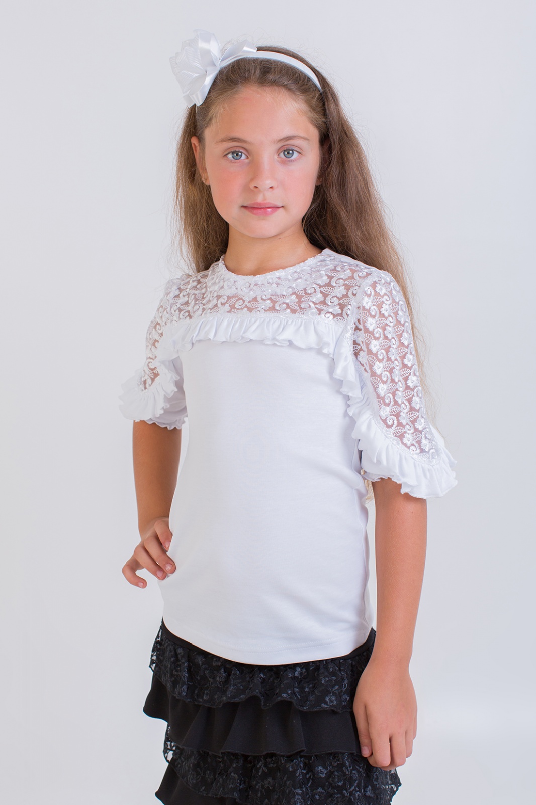 Описание: Блузка белого цвета выполнена из интерлока и оринтала. Очаровательные рюши на полочке и по рукавам придают изделию романтичность, застежка-пуговицы .Предназначена для школы .