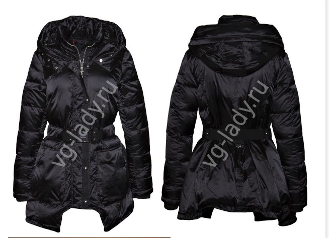 Куртка-парка, наполнитель пух, внизу затягивается, застегивается на молнию, рукава с трикотажным манжетом. Длина спереди -65 см, сзади - 72 см.