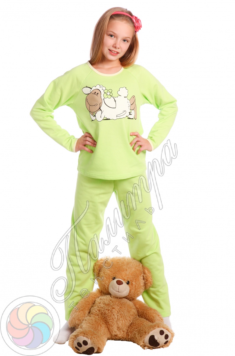 Детская пижама нежных тонов с забавным печатным рисунком. Модель свободного кроя, выполнена из мягкого трикотажного полотна с 100% содержанием хлопка, горловина и рукава декорированы контрастным кантом. Брюки на широкой эластичной резинке.
