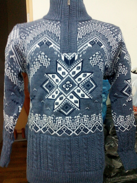Интересный мужской свитер с горловиной на молнии. Тема русской зимы изящно подчёркивается стилизованным рисунком в виде снежинок.