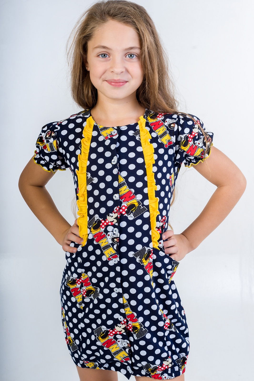 Описание: Халат для дома выполнен из набивного трикотажного полотна. Дополнением к рисунку ткани служат контрастные рюши, два кармашка в рельефах и рукав " фонарик".