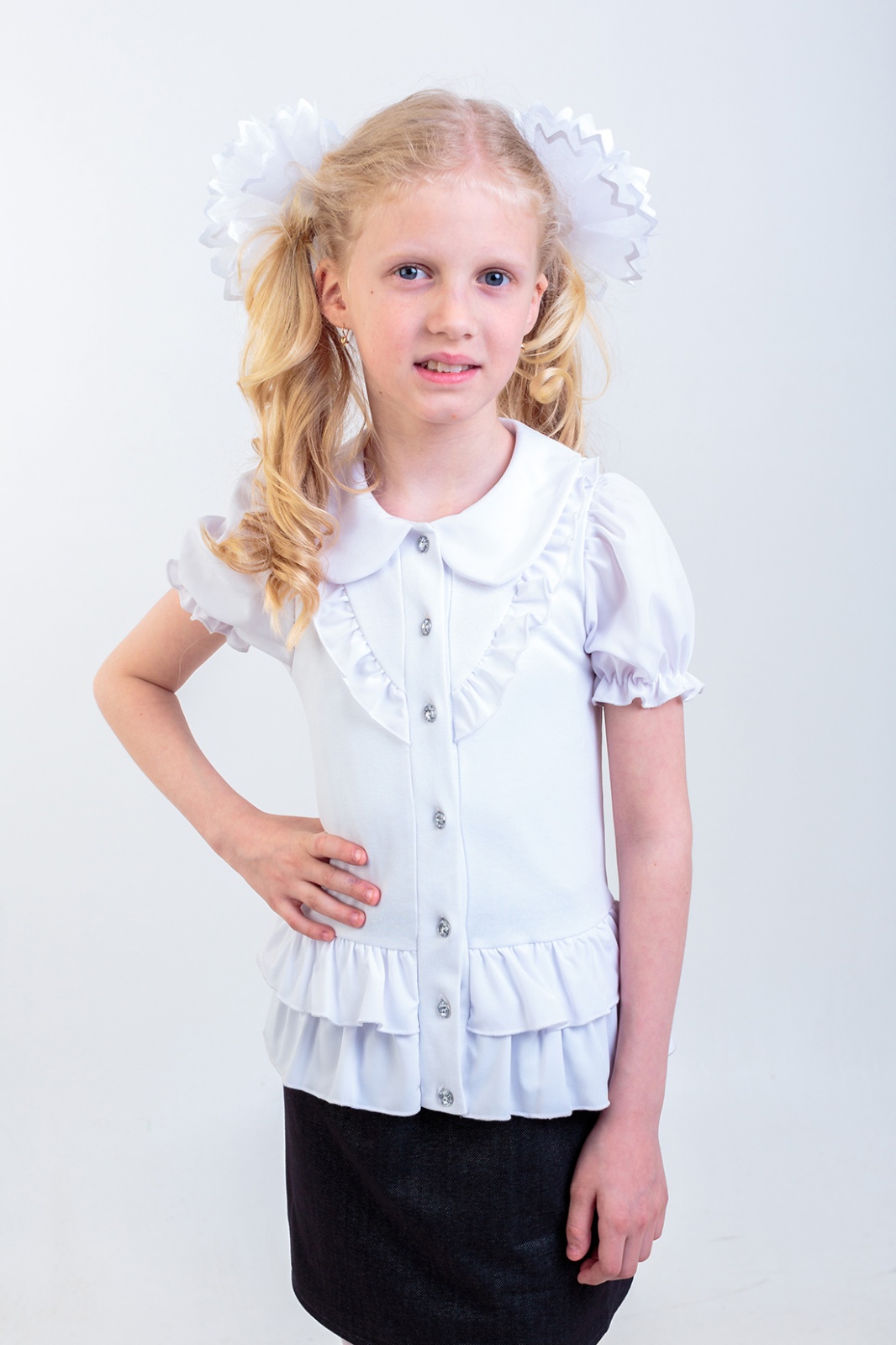 Описание: Блузка для школы и торжеств,изготовлена из интерлока,праздничный вид придают рюши и воланы из "Ниогары",рукав "фонарик " , застежка пуговицы .