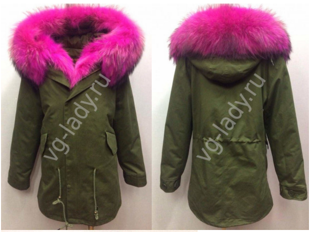 Куртка-парка, наполнитель верблюжья шерсть, подкладка отстегивается, с капюшоном, мех натуральный крашенный енот, ткань плотная х/б, длина - 81 см, рукав - 63см.