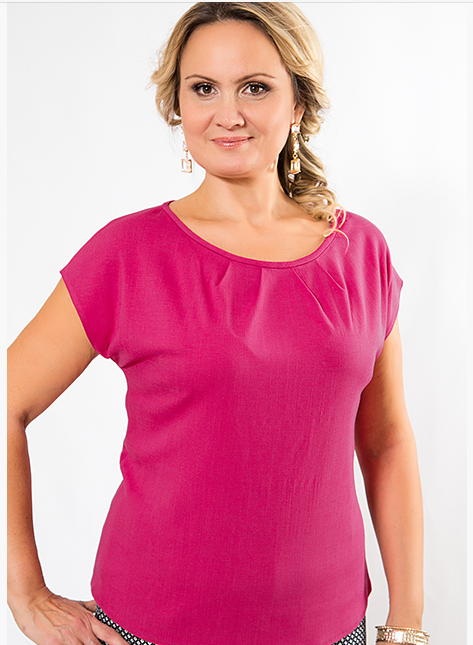 5% эластанОписание модели: Блузка-топ из эластичного льна ярко-розового цвета. Полуприлегающий силуэт. Небольшие складки по горловине переда. Рукав цельновыкроеный короткий. Длина по спинке от плечевого шва ок 59 см. На фото с брюками 322-5626.
