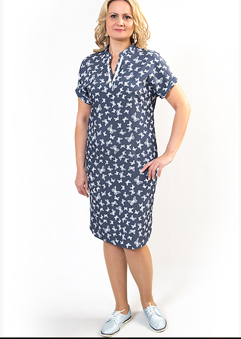 5% эластанОписание модели: Платье полуприлегающего силуэта из эластичной вискозной ткани. Джинсовый синий цвет с белыми бабочками. Воротник стойка, отделка репсовой лентой и небольшими пуговицами на переде и рукавах. Рукав цельновыкроенный короткий. Мягко скругленные разрезы в боковых швах. Длина по спинке от плечевого шва ок 105 см. Ремень в комплект не входит.
