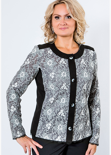 5% эластанОписание модели: Жакет комбинированный. Основа из оригинального вязаного двухслойного трикотажа, отделка из однотонного джерси. Центральная застежка на пуговицы. Рукав длинный. Кружевная тесьма по низу. Длина по спинке от плечевого шва ок 61 см. На фото с брюками 318-216 и юбкой 217-6224.