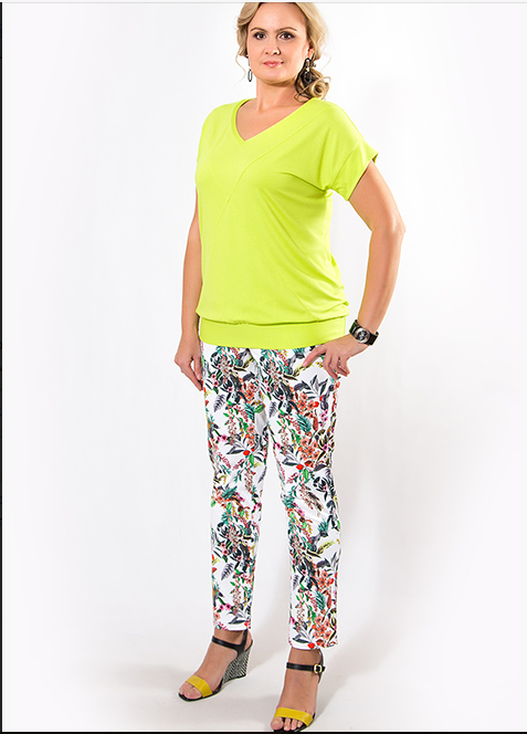 5% эластанОписание модели: Брюки из эластичного хлопка с ярким растительным рисунком на белом фоне. Прилегающий силуэт. Широкий пояс с застежкой на 2 пуговицы. Длина по боковому шву от верхнего края пояса 99 см. Ширина низа ок 17 см. На фото с блузкой 738-4210.