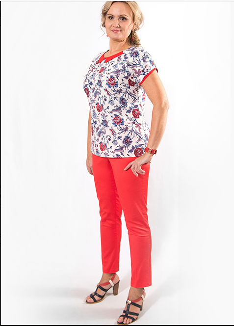5% эластанОписание модели: Легкие брюки из эластичного хлопка. Длина 7/8. Красный цвет, прилегающий силуэт. Широкий пояс с застежкой на 2 пуговицы. Длина по боковому шву от верхнего края пояса 99 см. Ширина низа ок 17 см. На фото с блузкой 891-1746.