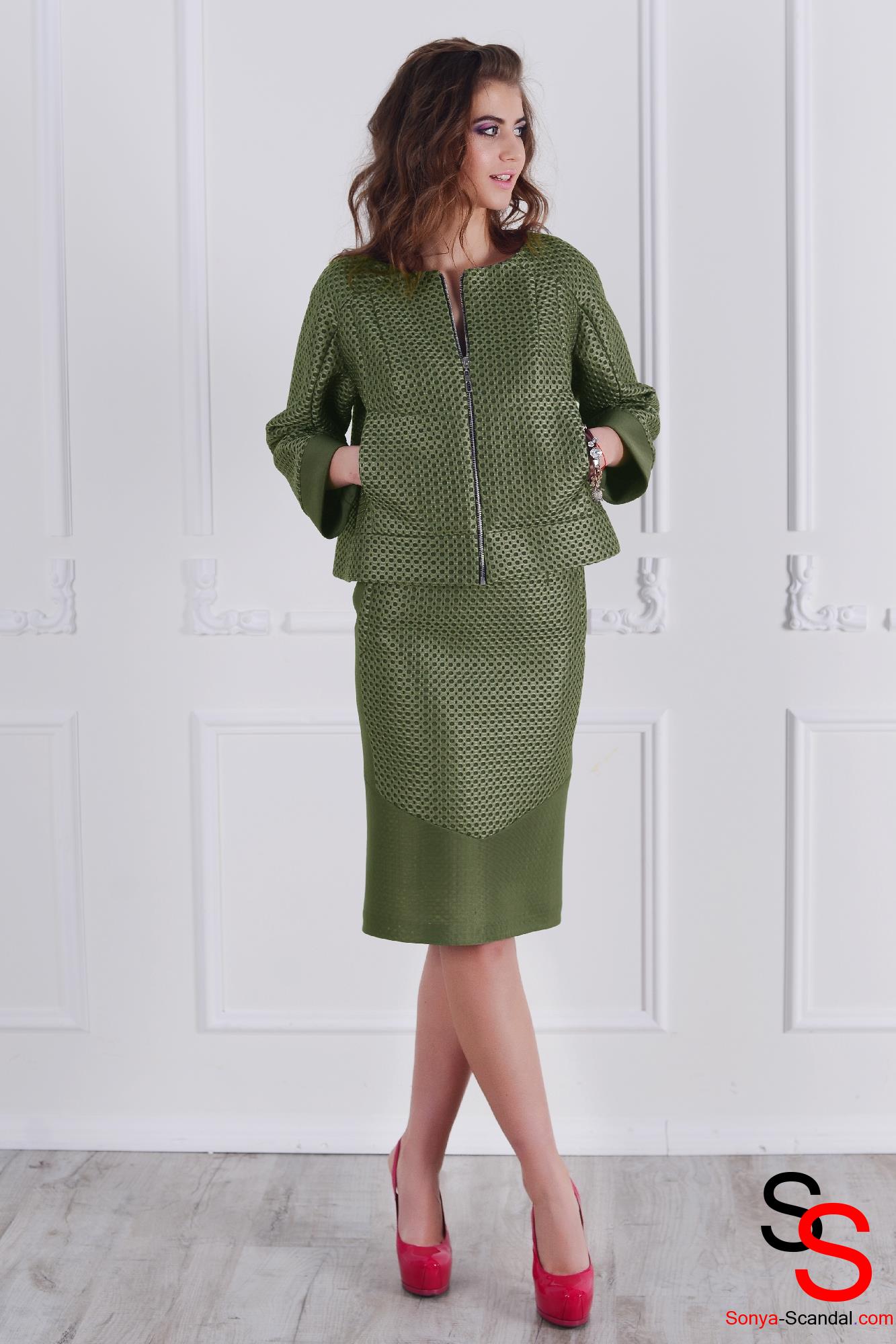 Описание: Костюм идеально сочетается со своим названием, пиджак выполнен в виде легкой куртки, свободный рукав, длина рукава 7/8, подобран широким кантом, впереди застежка на разъёмной молнии, сзади потайная молния, которой можно изменить ширину пиджака, юбка прямая, длина средина колена, сзади внизу разрез, юбка застёгивается потайной молнией сзади, материал тисненый итальянский неопрен, подбивка из эко кожи, длина верхушки 51см, юбки 61см.