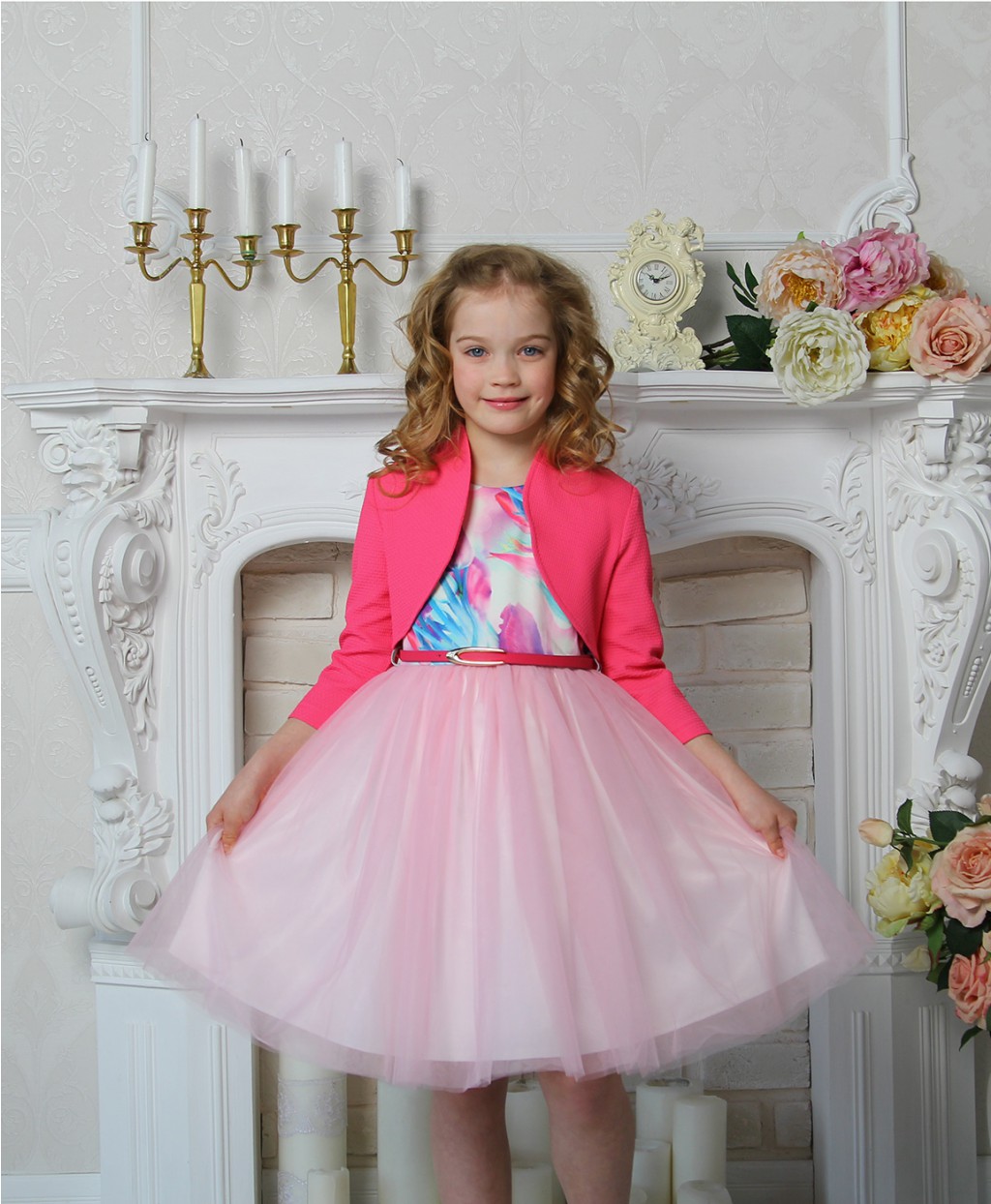 Шикарное платье для девочки. Такой наряд подойдет и на выпускной, и на день рождение. Верх платья сделан из очень красивого материала (хлопок-атлас). Юбка выполнена из сетки. Платье на подкладке. Сзади молния. В комплект входит платье, пояс и болеро.