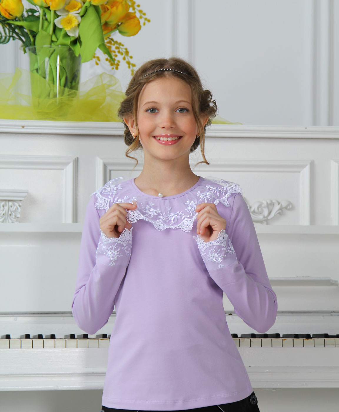 Трикотажная блузка с длинным рукавом. Воротник украшен нежным кружевом. Манжет рукава украшен кружевом. Возможно наличие страз.