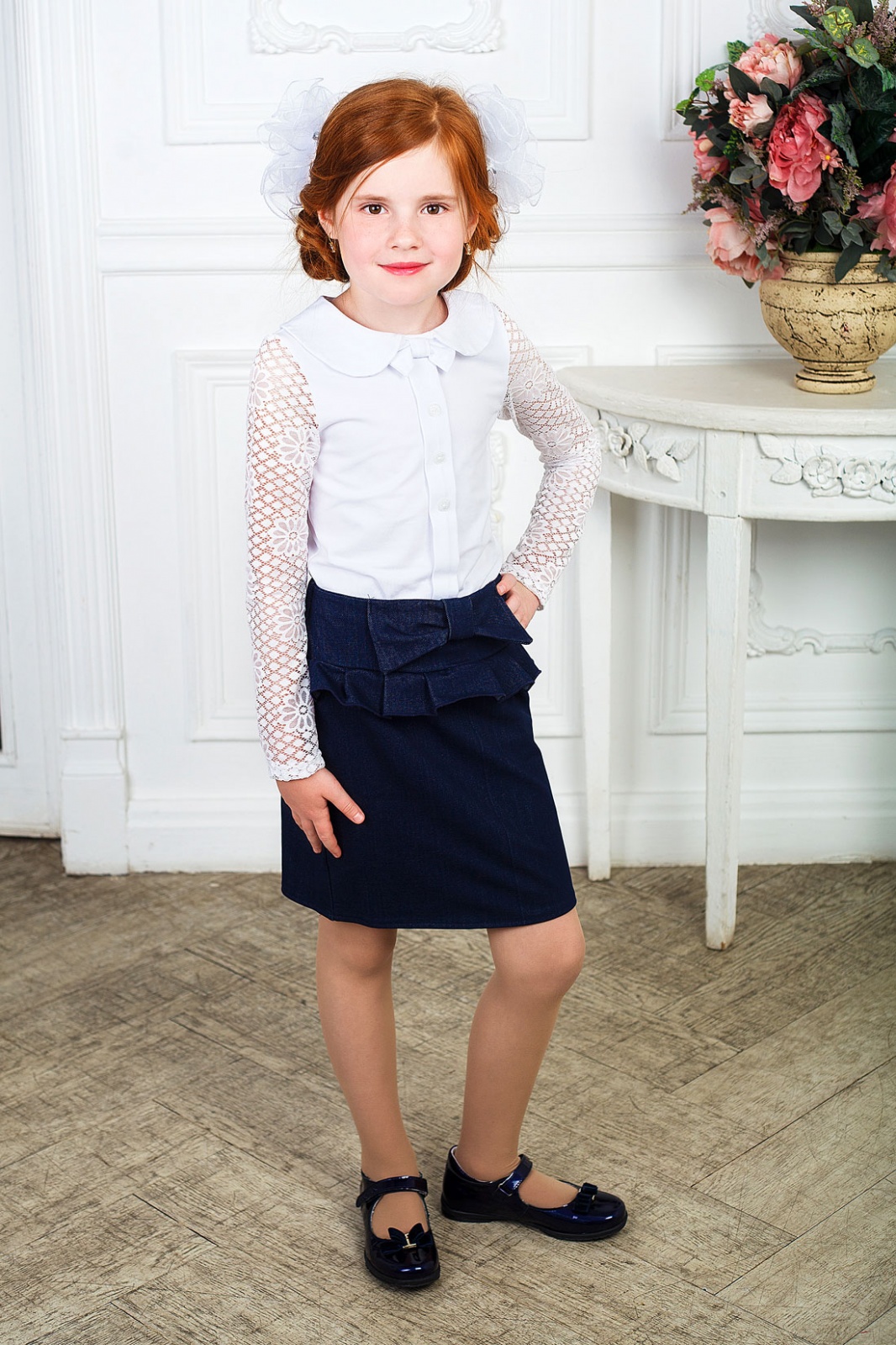 Описание: Блузка с воротничком,с планкой ,заканчивающейся бантиком,длинный рукав из гипюра .Рекомендована для школы.
