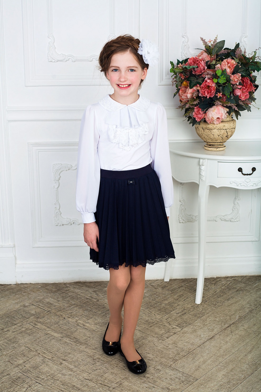 Описание: Блузка из трикотажного полотна ,с вставками из гипюра,с воротничком и длинным рукавом.Застежка -пуговицы.Рекомендована для школы.
