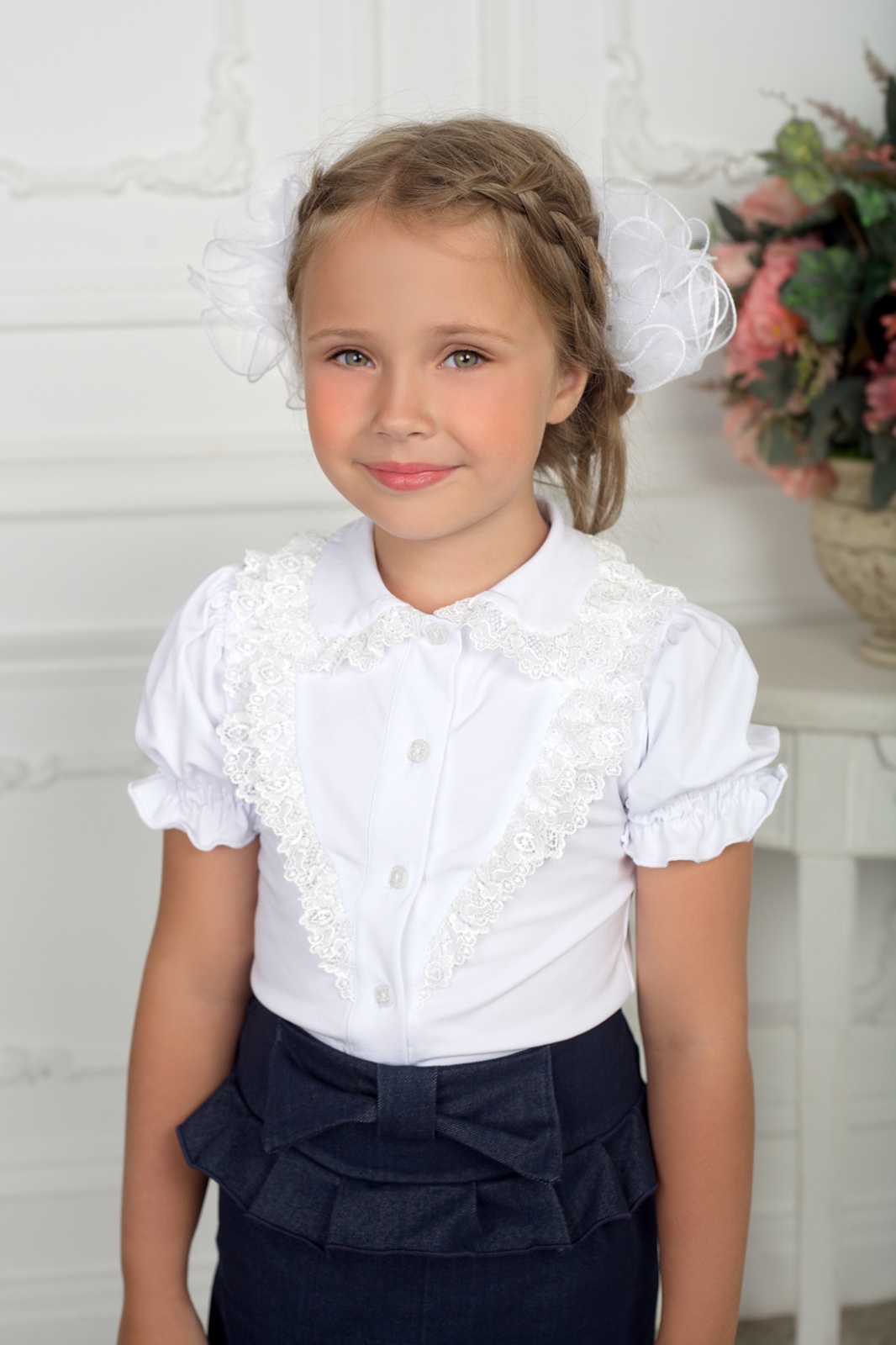 Описание: Блузка из трикотажного полотна ,с вставками из гипюра,с воротничком и длинным рукавом.Застежка -пуговицы.Рекомендована для школы.