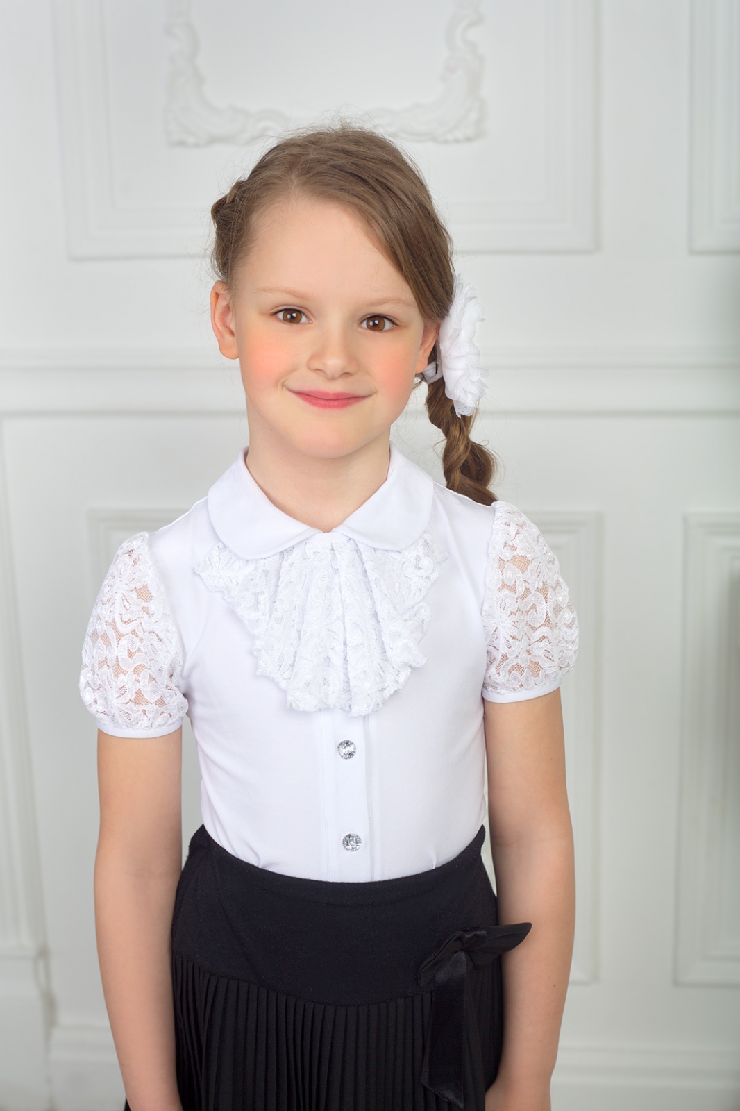 Описание: Изделие изготовлено из эластичного трикотажного полотна.С отложным воротничком,со съемным "жабо",с рукавочками "фонарик" из гипюра.Предназначена для школы