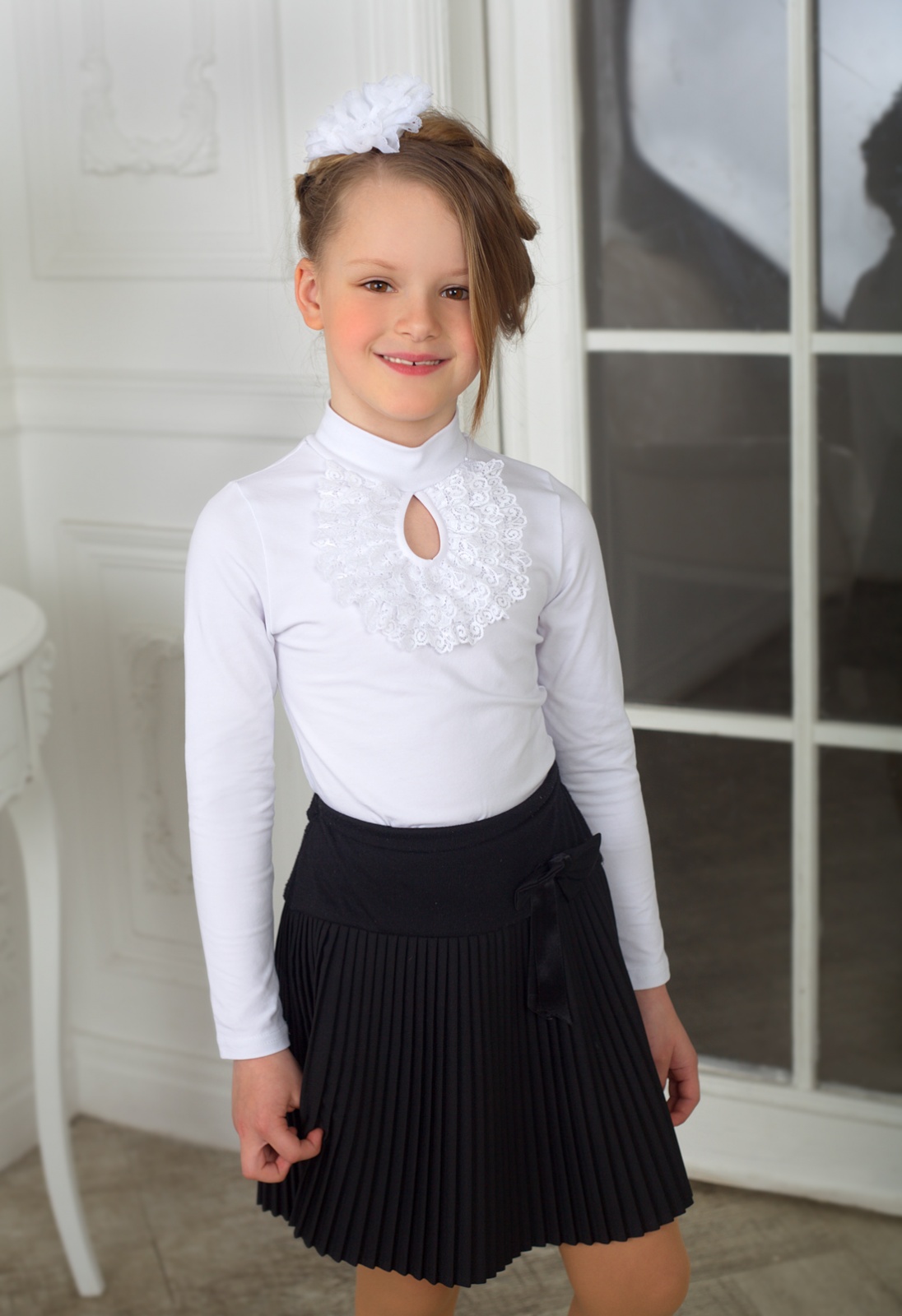 Описание: Блузка из трикотажного полотна .Украшением на полочке служит кружево,оформленное ввиде "жабо"вокруг выреза-"капелька".Рекомендована для школы.