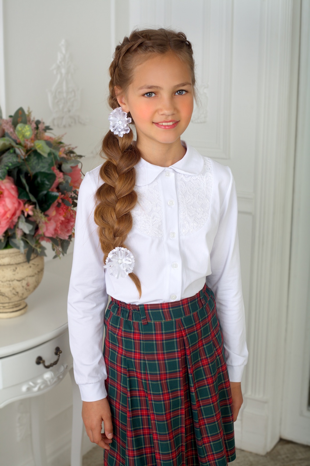 Описание: Блузка из трикотажного полотна ,с вставками из гипюра,с воротничком и длинным рукавом.Застежка -пуговицы.Рекомендована для школы.