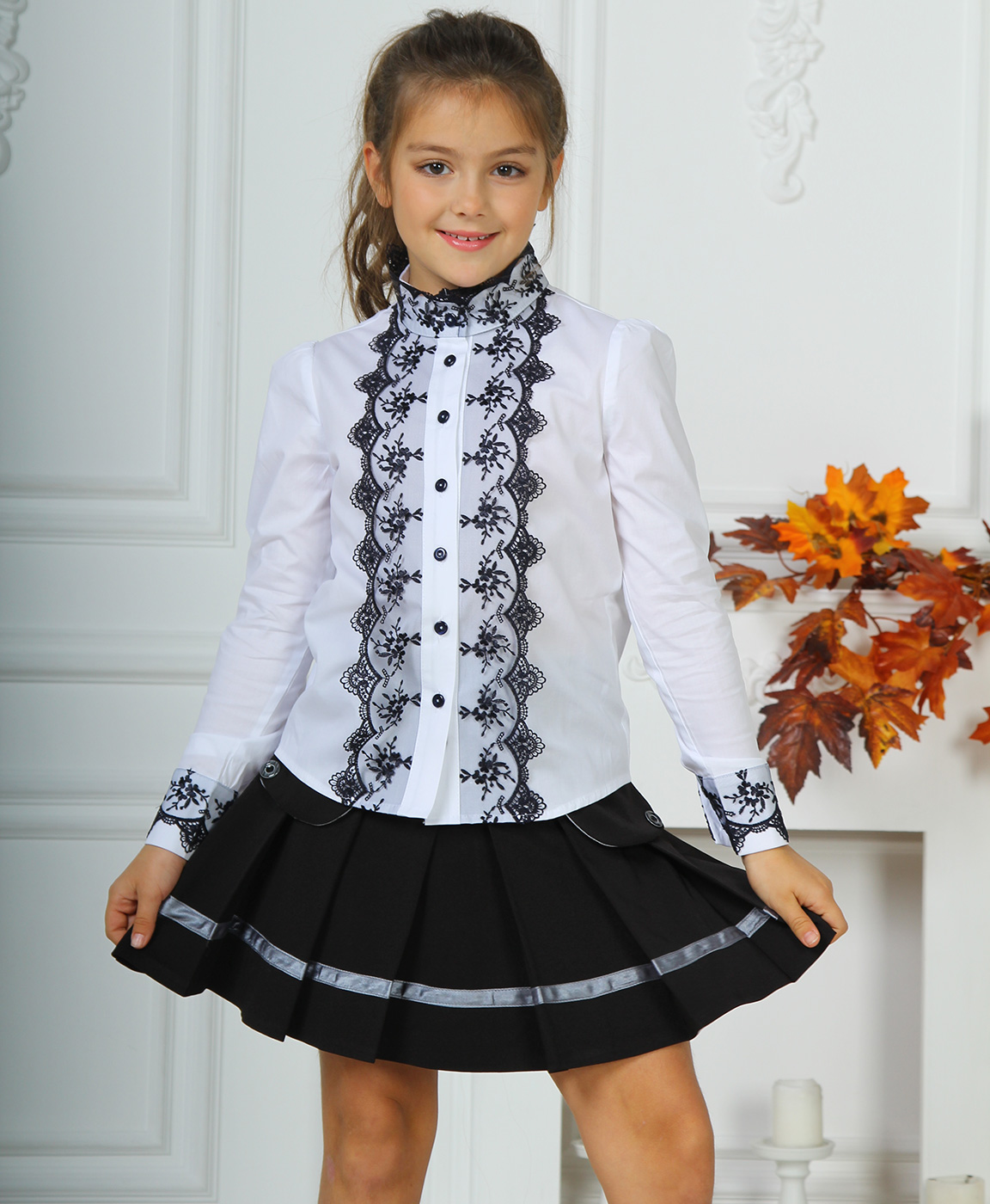 Великолепная детская блузка с длинным рукавом. Круглый воротничок, спереди рюша из гипюра, рукав фонарик.Ткань блузки великолепно стирается и гладится.