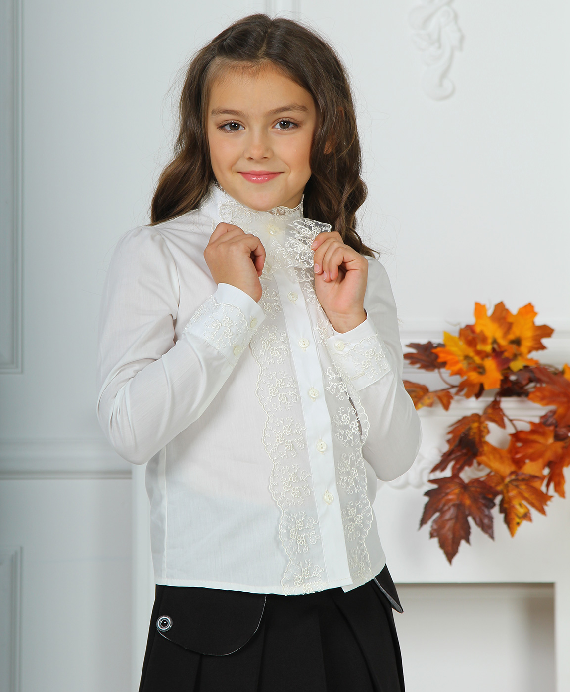 Великолепная детская блузка с длинным рукавом. Круглый воротничок, спереди рюша из гипюра, рукав фонарик.Ткань блузки великолепно стирается и гладится.