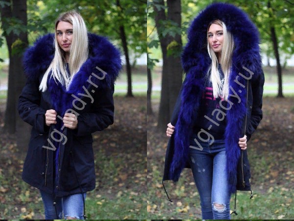Куртка-парка, наполнитель верблюжья шерсть, подкладка отстегивается, с капюшоном, мех натуральный крашенный енот, ткань плотная х/б, длина - 81 см, рукав - 63см.