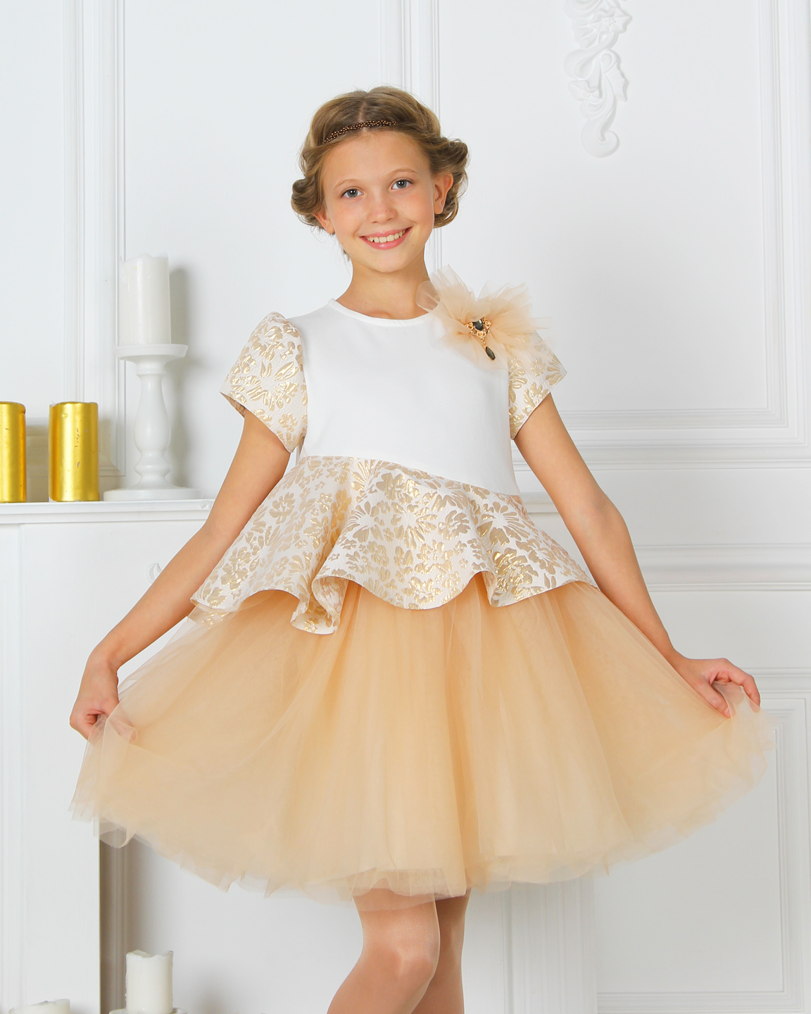 Шикарное платье выполнено из турецкого трикотажа и сияющего материала, пышная юбка состоит из сетки. Платья украшена в виде банта из сетки с брошью. Данное платье великолепно подойдет для любого праздника.