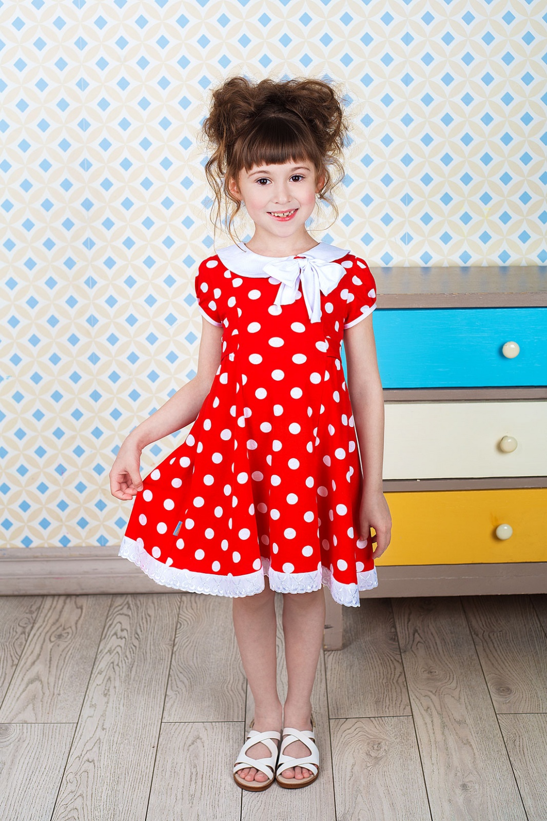 Описание: Платье выполнено из трикотажного полотна.Украшением служат :ассиметричный воротничек с бантом и шитье по низу юбки.Рукав "фонарик",рельефы по центру платья и поясом,завязывающимся на бант.