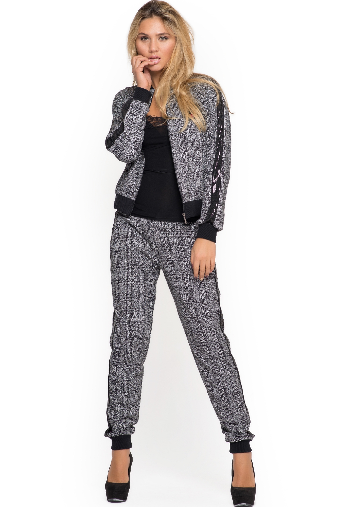 Полуспортивный костюм тройка из приятного трикотажа. Толстовка на молнии, по горловине закругленный воротник стойка, рукав и низ толстовки подбиты манжетам, по всей длине рукава вшит лампас из лицевых пайеток. Брюки прямого кроя в низу подбиты манжетам, по бокам внутренние косые карманы, по всей длине брюк так же, как и на рукавах вшит лампас. К костюму прилагается топ из микромасла, декорированный кружевом в области груди.