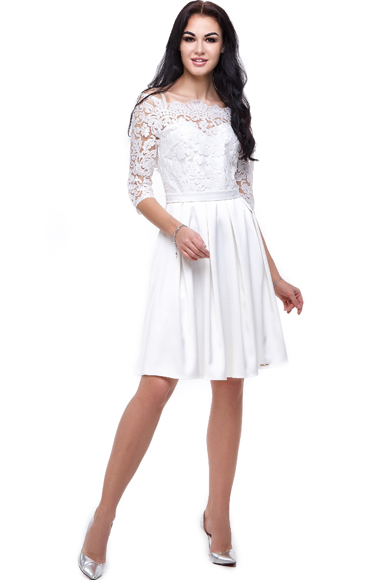 Верх платья состоит из сетки с вышивкой, а низ платья состоит из атласа. Пояс в комплекте. На спинке потайная молния.
