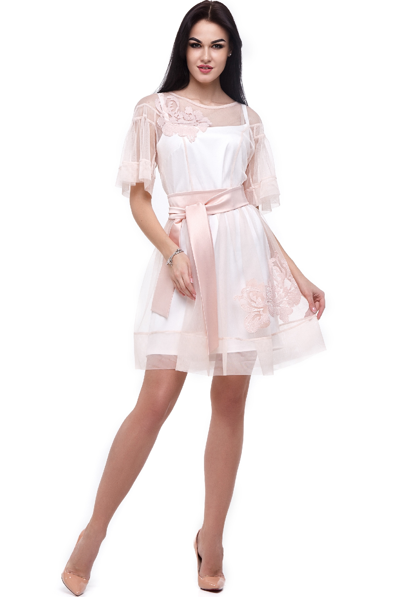 Платье двойка. Внутренне платье из атласа. Внешнее платье из сетки с вышивкой и пайетками, на спинке потайная молния. Атласный пояс в комплекте.