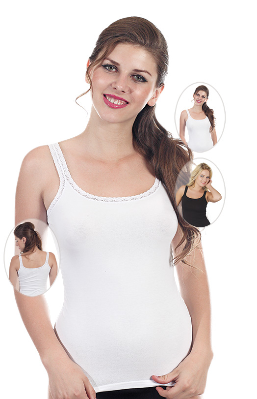Строгая трикотажная майка (арт. 6687) для тех, кто любит классику в одежде. Майка хорошо садит на фигуре, а натуральный материал не вызывает раздражения и дискомфорта. Модель имеет широкие бретели и глубокий овальный вырез декольте. В вырез на груди и края бретелей обрамляет декоративная отделка. Спинка изделия имеет аналогичный овальный вырез, открывающий спину до середины лопаток. Майка выпускается в двух расцветках: черной и белой. Модель представлена в четырех размерах: 46-48, 50-52, 54-56, 58-60.