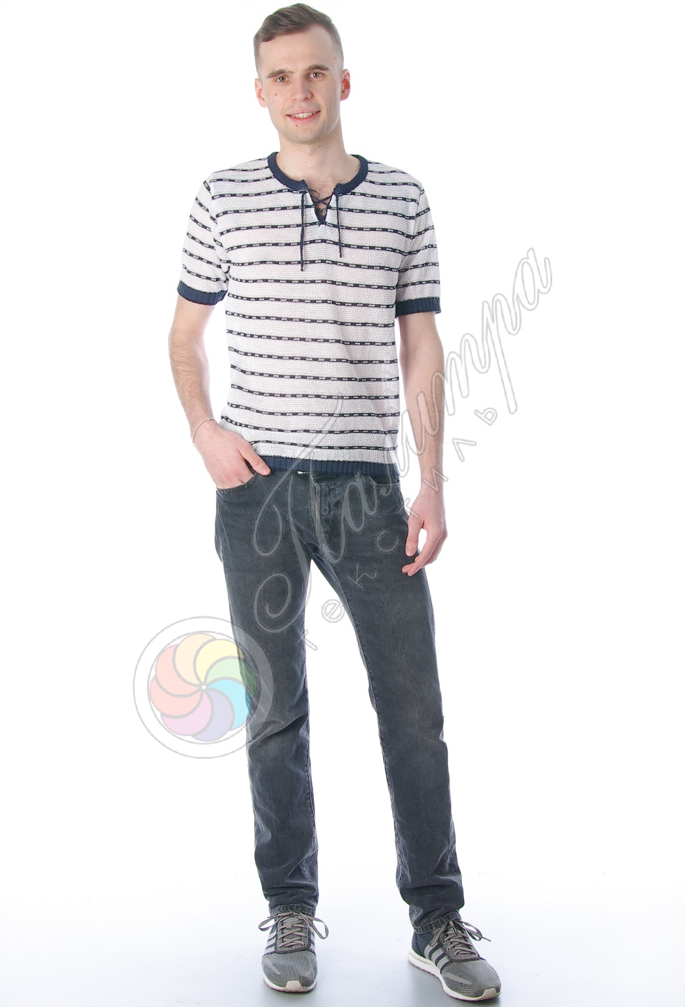 Стильная полосатая футболка-сетка из натурального качественного хлопка.