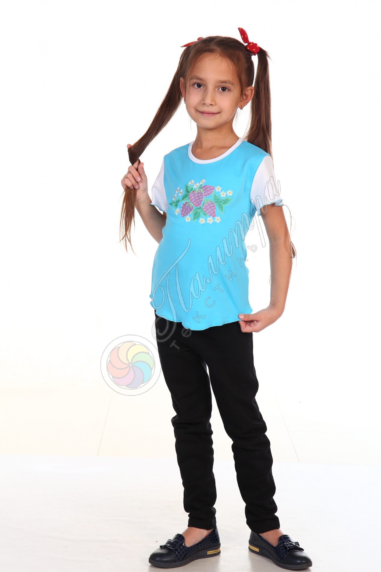 Комбинированная футболка для девочки из ткани интерлок с красивой вышивкой "Ягодки" будет напоминать о тёплых солнечных днях.