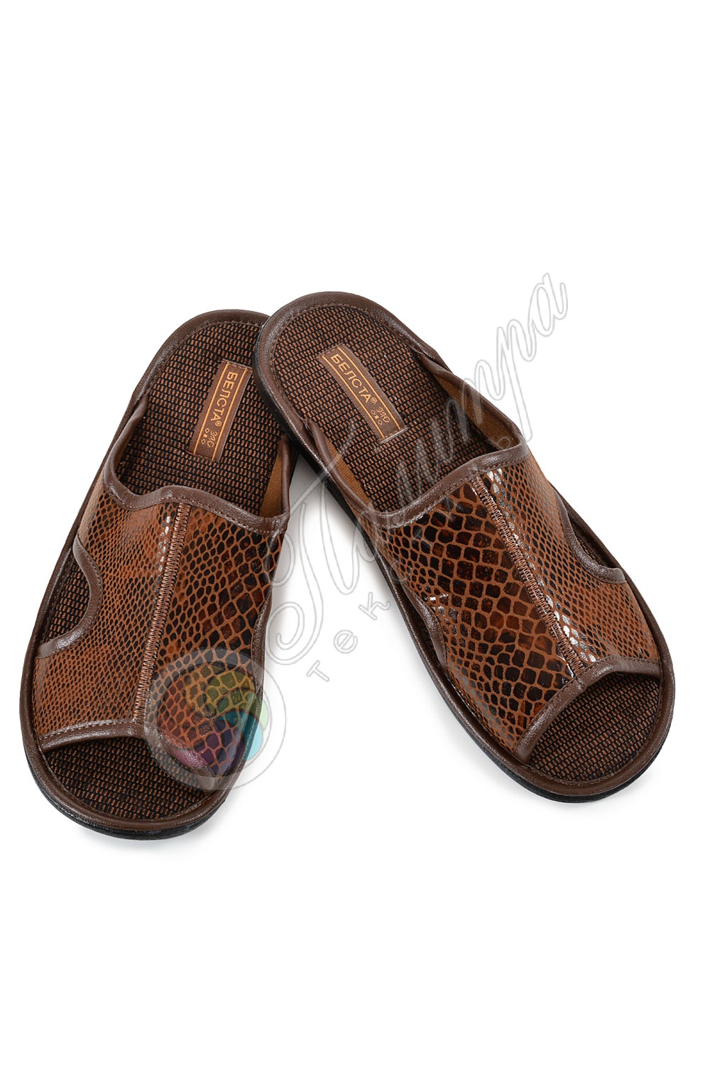 Мужские открытые домашние тапки из мягкого кожзама. Подошва полиуретановая, стелька - хлопковый текстиль. Модель известной фабрики "Белста", которая славится отличным качеством! Побалуйте мужчин хорошей и удобной обувью! Внимание: продаются без подборки по цвету.