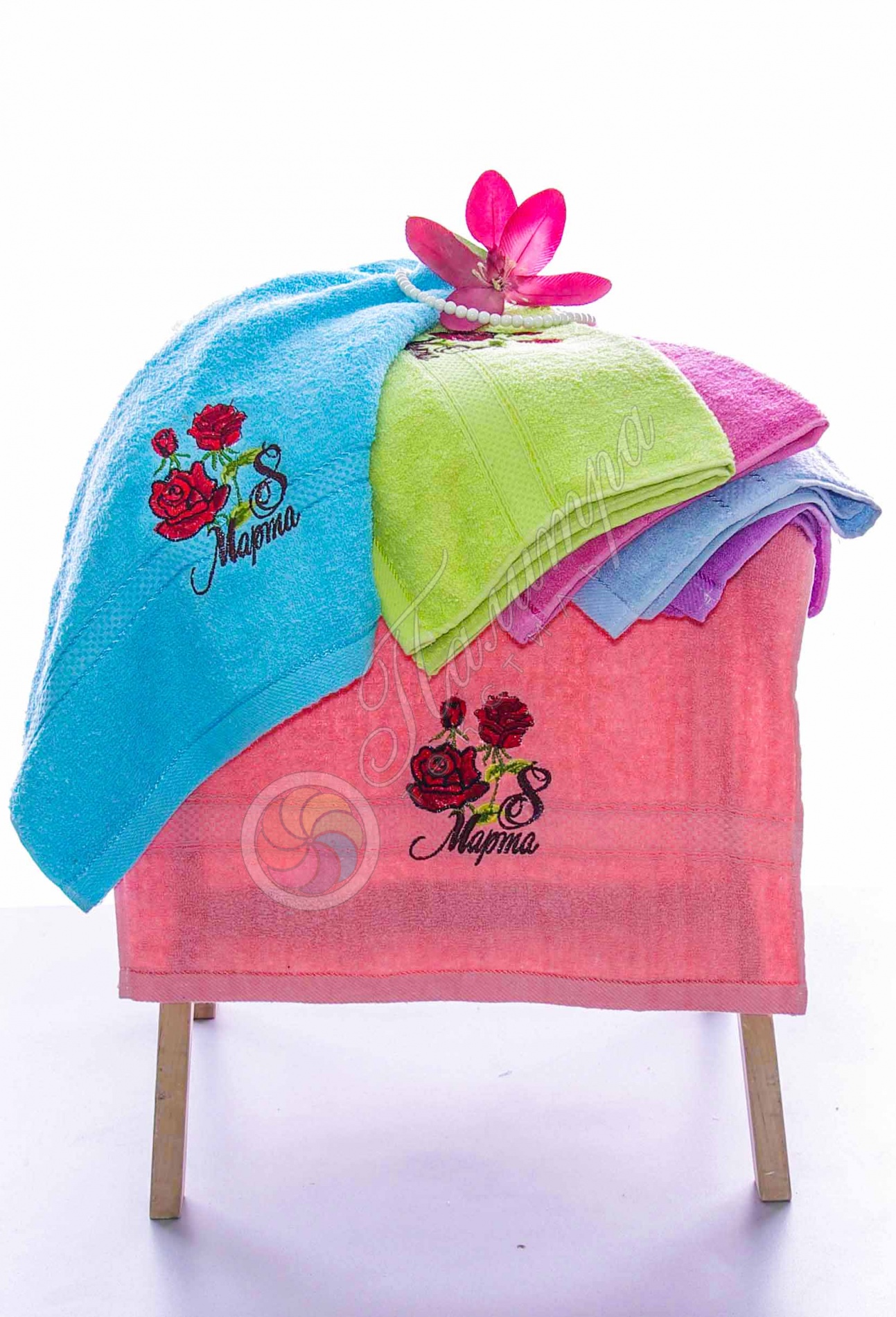 Мягкое махровое полотенце из хлопка с жаккардовой отделкой и вышивкой в виде розы. Нежное и приятное к телу, отлично впитывает влагу, станет прекрасным подарком для милых дам. Производство Китай.