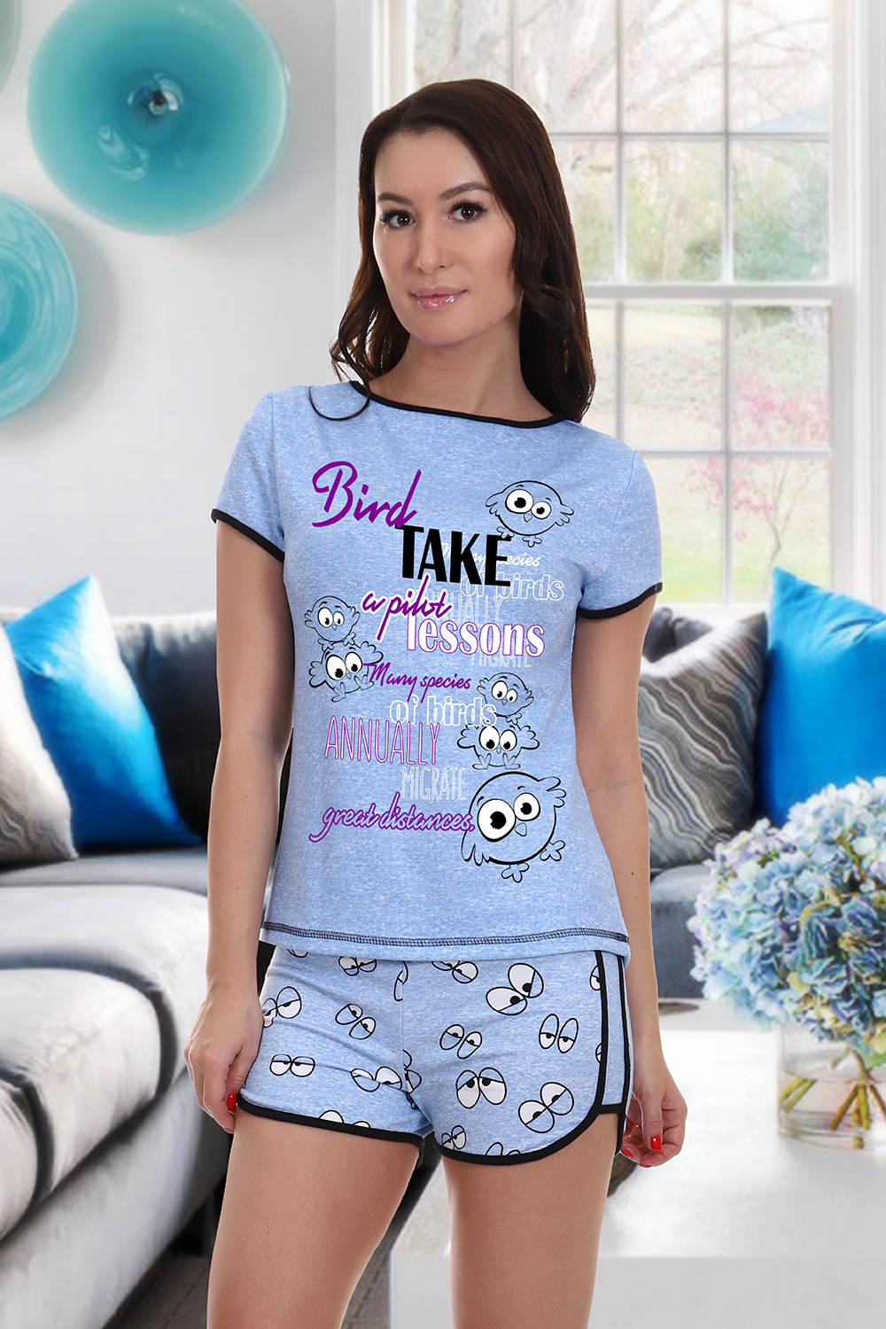 Комплект состоит из футболки и шорт. Футболка полуприлегающего силуэта с коротким рукавом, округлой горловиной. Шорты спортивные на поясе и боковыми вставками. Горловина, низ рукавов, низ шорт окантованы бейкой контрастного цвета. По низу футболки расположена отделочная строчка контрастными нитками