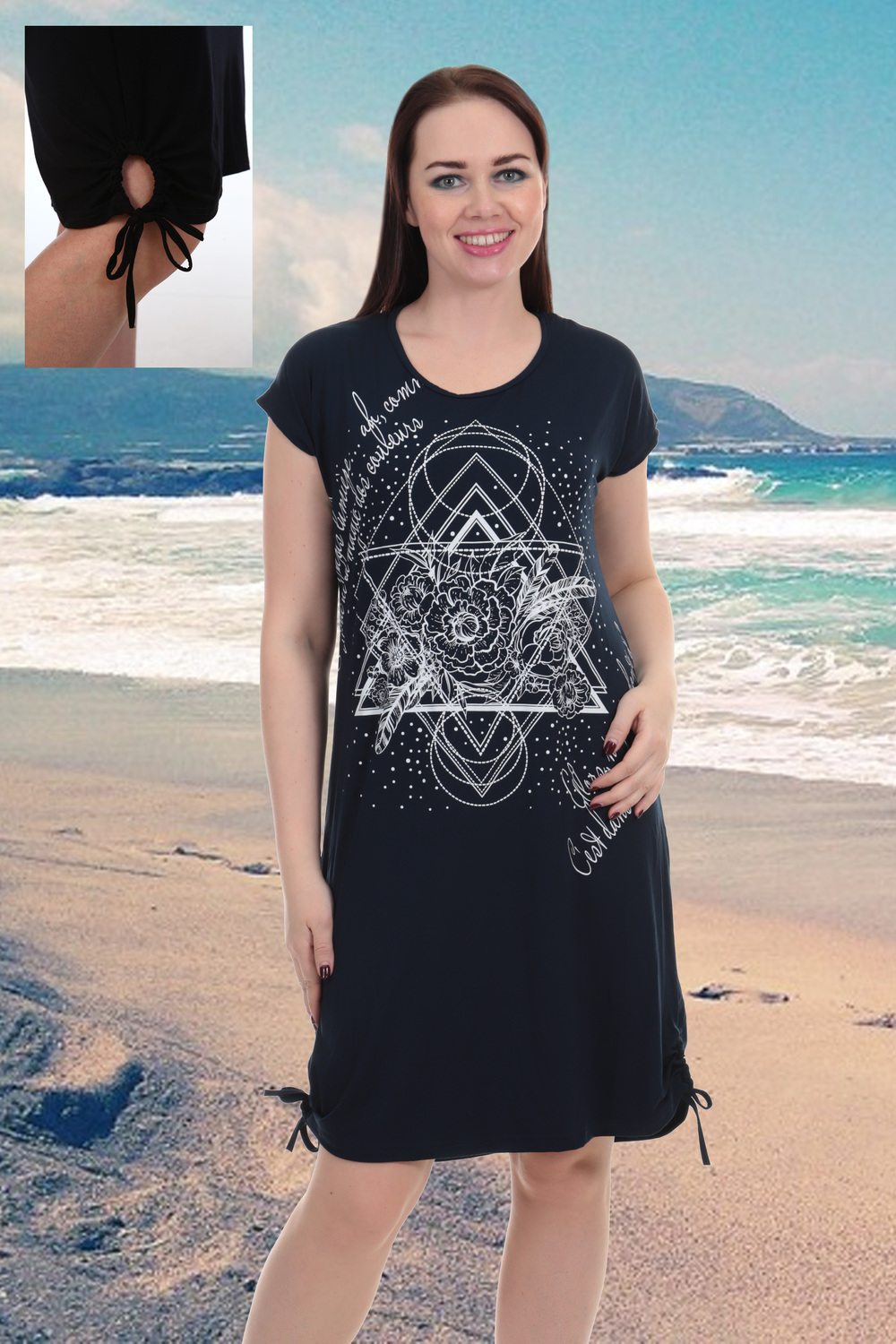 Платье прямого силуэта длиной ниже колена с декоративными шнурами-стяжками в нижней части боковых швов, округлой горловиной, со спущенным плечом. В верхней части спинки выполнен фигурный вырез. Горловина окантована бейкой