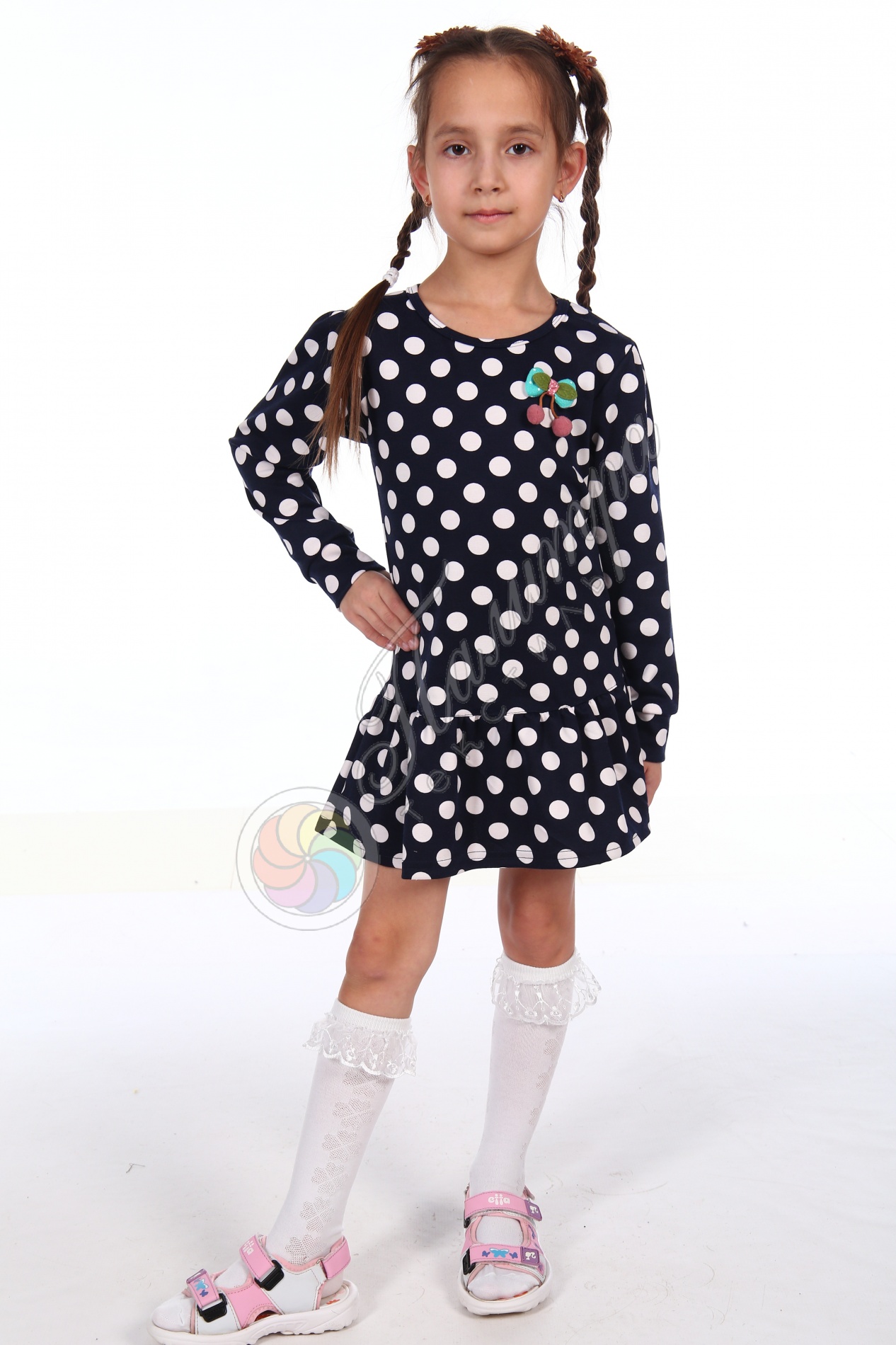 Симпатичное платье прямого кроя с заниженной талией и пришивным воланом из мягкого, эластичного трикотажа, рукава на манжете.