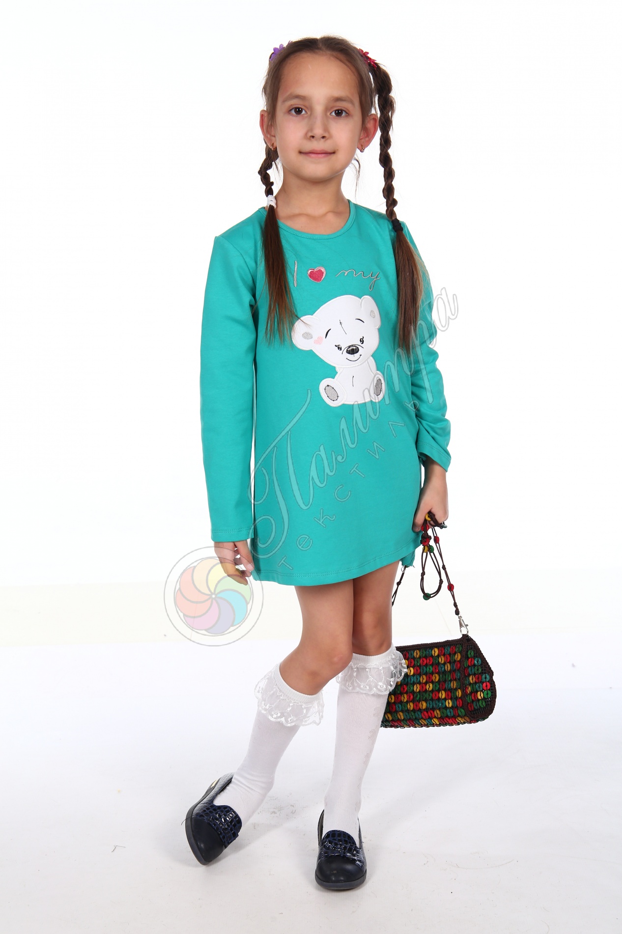 Стильное платье для современных и модных девочек из футера с лайкрой. Модель слегка расклешённая, на груди мягкий мишка добавляет нежности. Отличный вариант к наступающей весне!