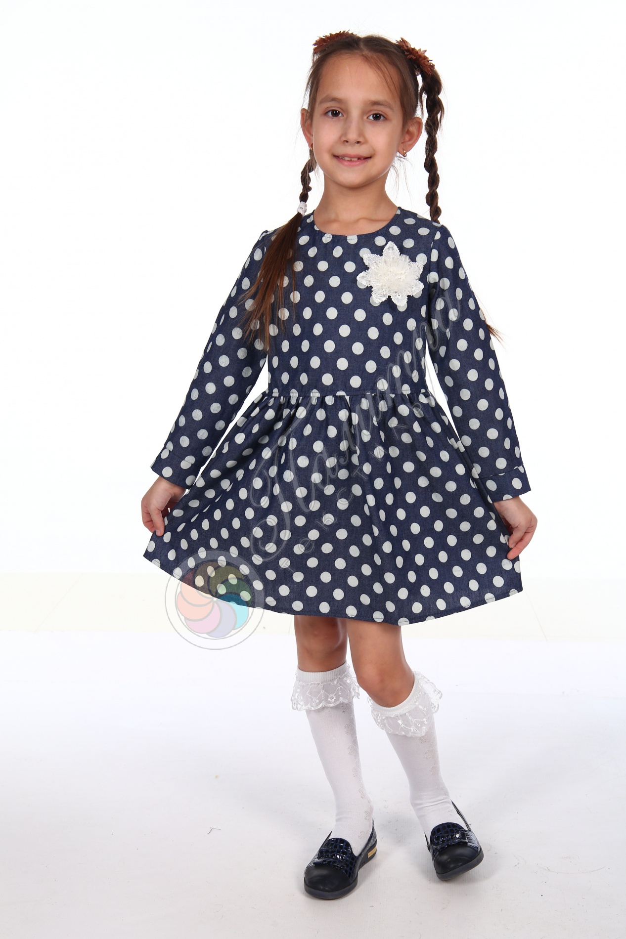 Стильное платье с отрезной пышной юбкой для модных милашек! Украшение на модели "кружевной бантик" дополняет образ, по спинке застёгивается на кнопочки до талии. Ткань лёгкая джинса.