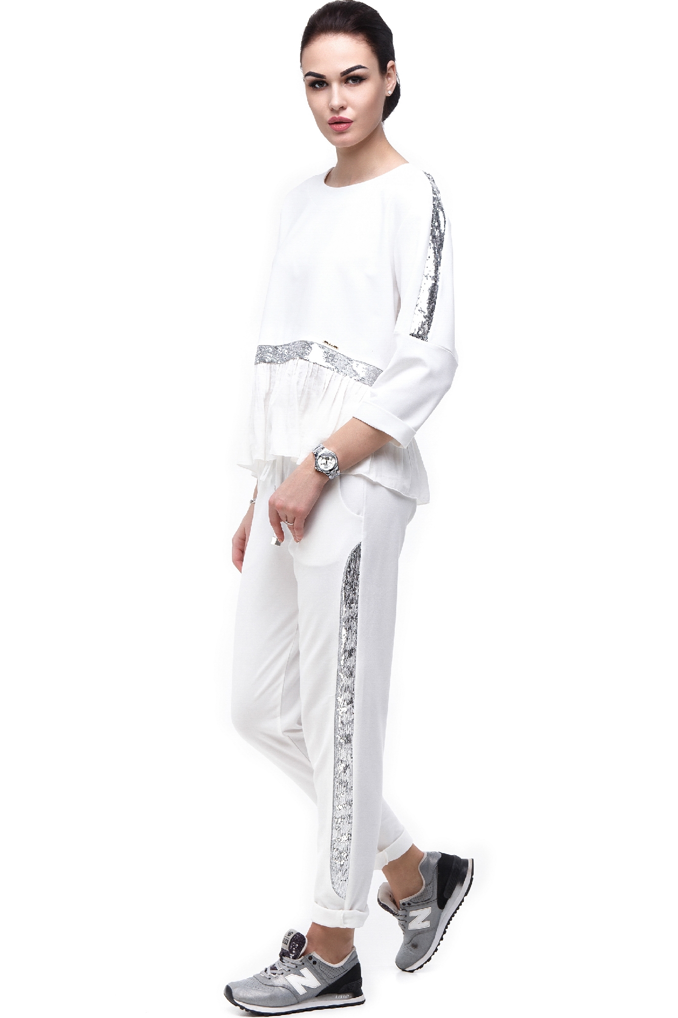 Полуспортивный костюм. Трикотаж двунитка, костюм декорирован пайетками, понизу верхушки шёлк. Брюки зауженные, по бокам косые карманы.